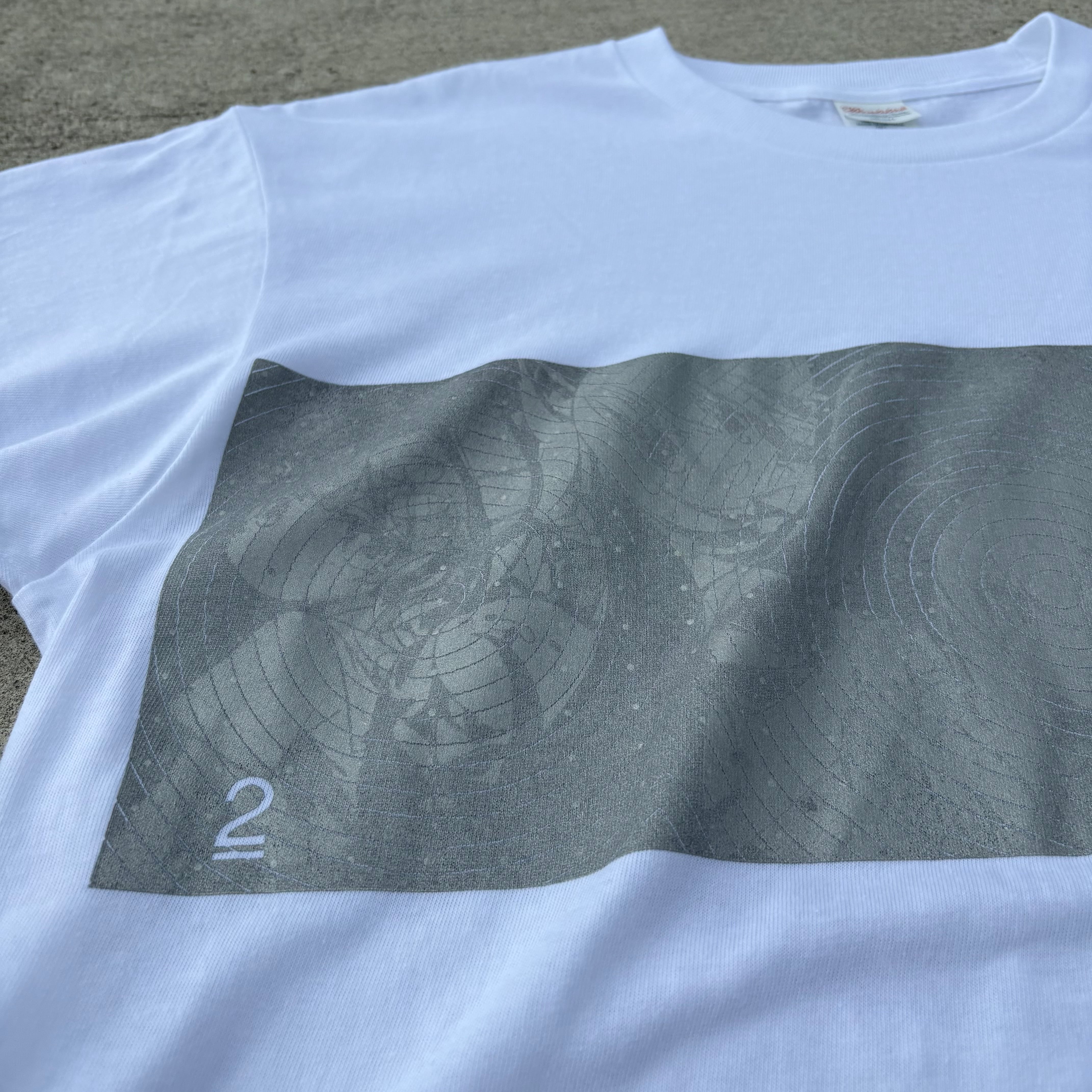 また今回は作り方にもこだわりがありリフレクタープリントの厚みの差で絵柄出す手法でプリントを行い、角度によってリフレクタープリントの反射する光の量が異なり絵柄出てきたり無くなったりするすごく不思議なTシャツになっています。