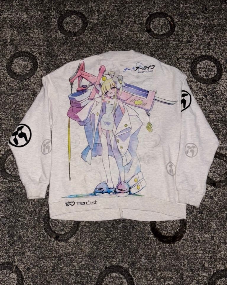 甘口コレクティブ×伝説の途中のメインフライヤーをバックに大きくプリントされ、フロントには色んな大きさのNerdistロゴを着ては刷って着ては刷ってと着用した時にかっこいい位置にプリントしました!!